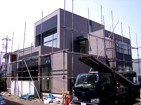 外壁の色は、家のイメージを決定する重要なファクターだけに、御施主さんと充分検討し決めました。御施主さん共々非常に悩みましたが、この色に決めて良かったと思います。スパンドレルやルーバーのガンメタリックの色とも良く合っているんではないでしょうか。内部も大体出来上がり、もうすぐ竣工です。