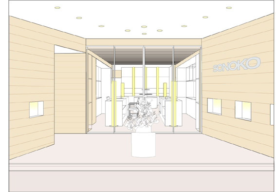 エントランス部分と店舗の内装デザインを杉浦事務所が担当しました。壁のボーダー、家具の木目も横方向、と横のラインを強調し、人々を中に引き込むようなデザインが特徴的です。銀座店とは雰囲気ががらりと変わっています。ウォールナットの家具に左官仕上げの壁、といった具合に茶を基調とした落ち着いた仕上がりになっています。