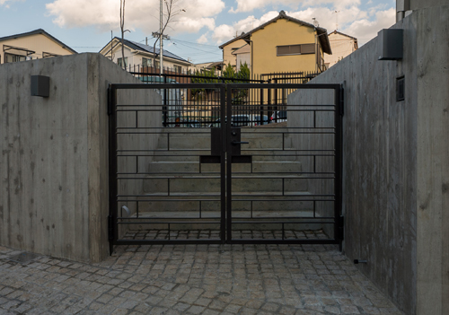 門扉2つと面格子が西側道路から同時に見えてくるので、それらのデザインを