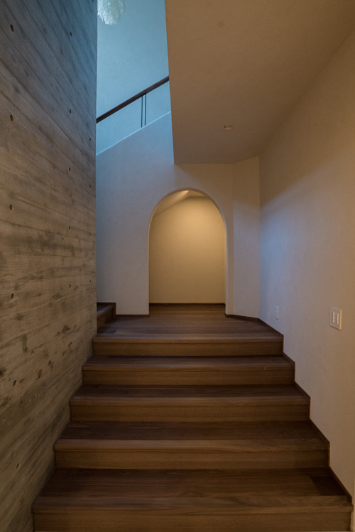 力強いコンクリート面とは対照的に階段はエッジ部をR面処理をして珪藻土仕上