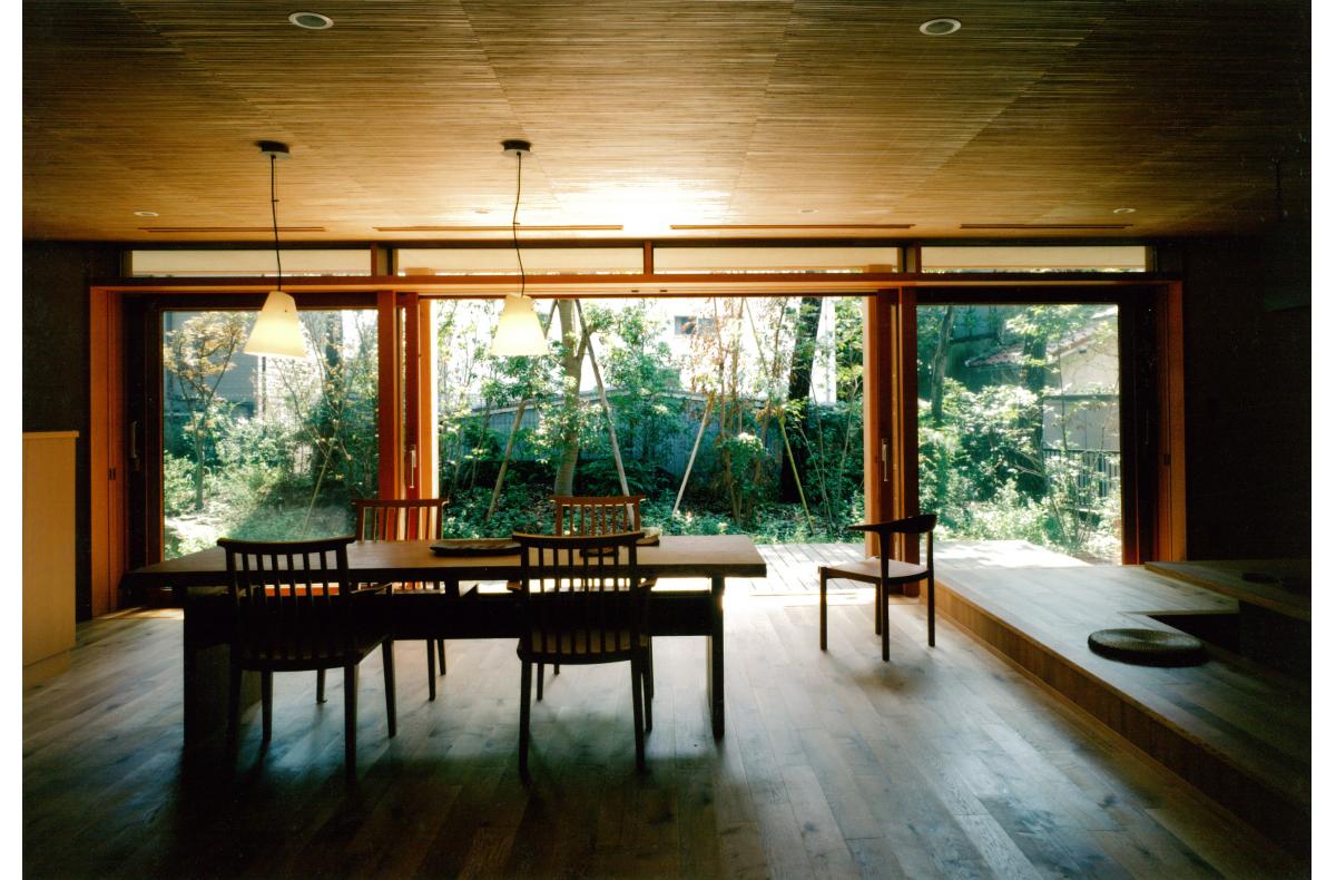 昔ながらの湘南の雰囲気が色濃く残る鵠沼の閑静な住宅地にあり、黒松の巨木が敷地を見下ろす。自然と素朴さをキーワードに、伝統建築の手法と独自のモダン感覚を融合させた。素材には特にこだわり、20cm×24cmの米松の通 し柱を骨格とし、内外とも珪藻土をふんだんに塗り上げ、楢無垢板の床、薩摩葦の天井、土間の芦野石と本物を重視した。建物を分断するようにある通 り土間は、奥へ誘うように斜めに絞りながら空間同士を繋ぐ。本来、土間は外部と繋ぐものとして、自然の恵みとの接点であり、作業の場であったと考えるが、今のライフスタイルに合わせた新しい土間を形にした。メインスペースとしてのリビングダイニングは自然を取込む開放性を有し、風と対話できるような空間とした。2階にはプライベートスペースを配し、それぞれをブリッジで繋ぐことで空間に流動性を生むことができた。