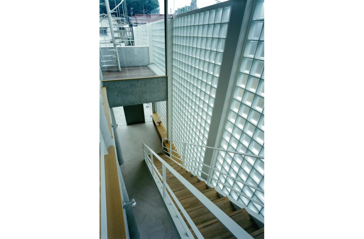 半透明のガラスブロックはコートハウスの内と外、上階と下階とを隔てつつも緩やかに繋ぎ、この家全体に「光のうつろい」を与えている。また、このガラスブロックの壁は中庭を囲う要素であるとともに、建物のファサードであり、街区に対して「家の顔」として存在している。