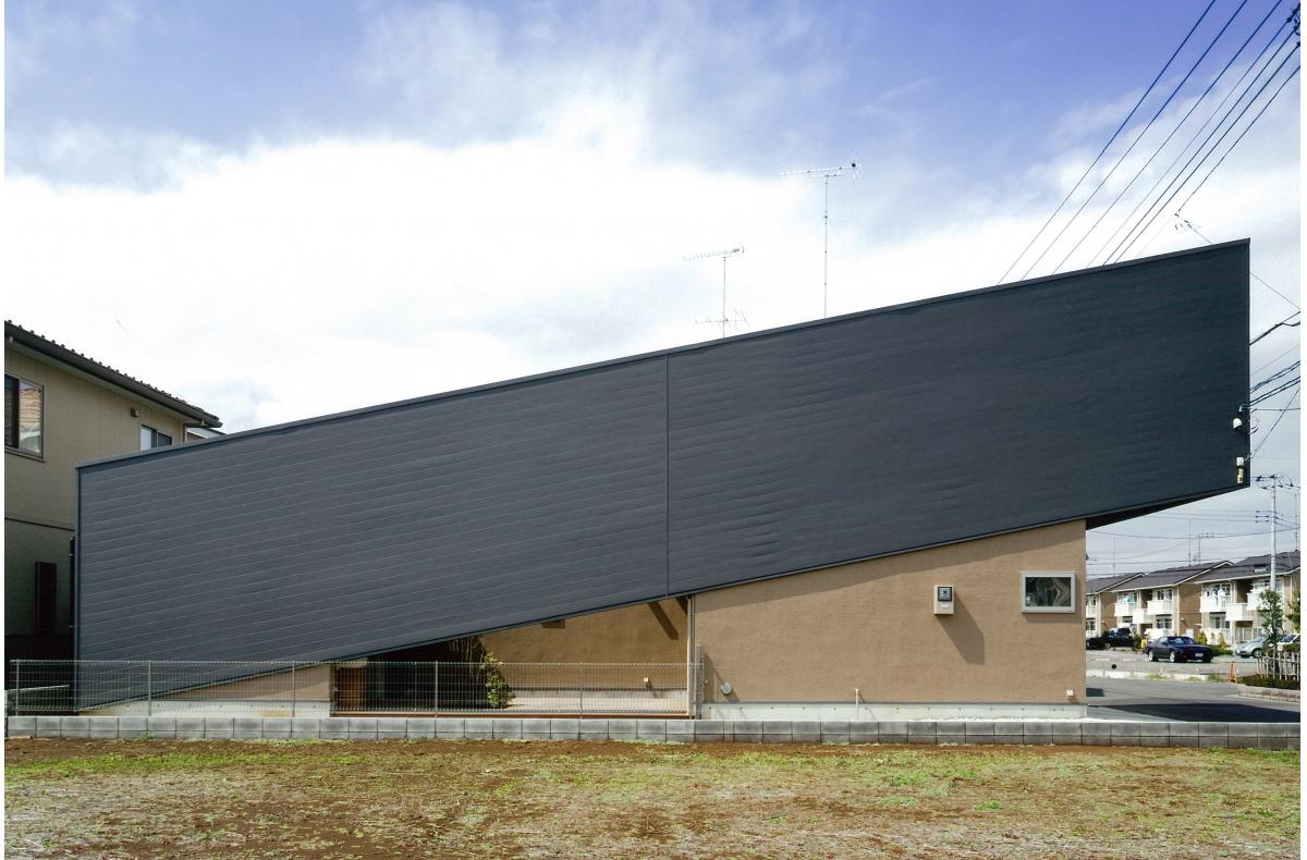 現在進行形で開発が進むつくばみらい市に建つ戸建住宅である。コの時型プランの建物全体を「斜め」に走る壁は、強いデザイン性を生み出し、生活を包む程よいバリアと断熱効果も期待できる。