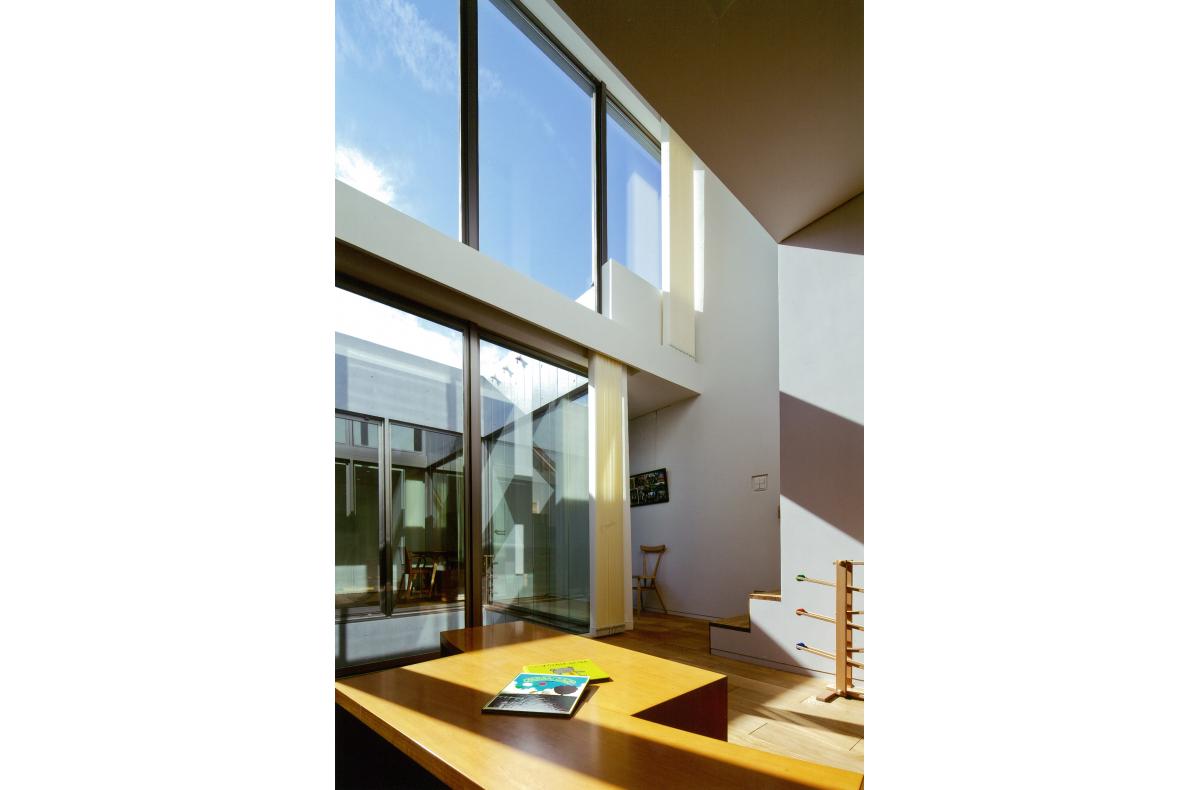 都心の古くからある商店街が立ち並ぶ一角に、若いご家族のための住宅を計画した。周囲は2~3階建ての商店やアパートが所狭しと立ち並び、良好な景観や採光が望めない場所だが、防犯性に優れ周囲の目線を気にすることなく暮らせる明るい住宅を希望された。南北に細長い敷地形状を最大限生かし、この条件を満たすためにライトウェル(光井戸)を設けた。四周の外壁の開口部を極力省き、ライトウェルに面して大きなガラス面を設けることで、堅牢でありながらも明るい住宅とすることができた。